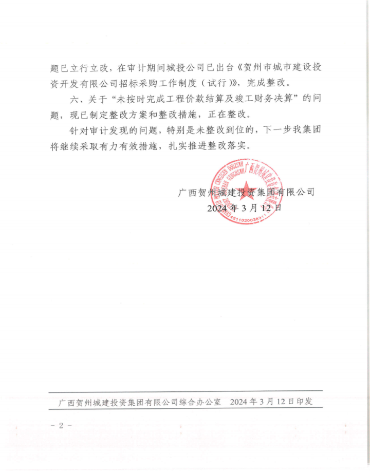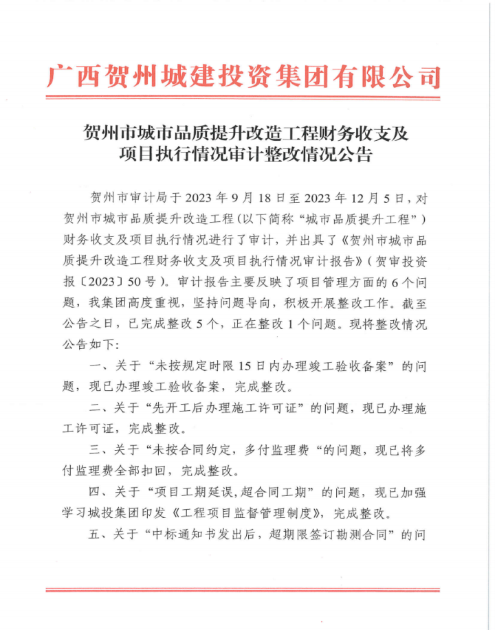 賀州市城市品質提升改造工程財務收支及項目執(zhí)行情況審計整改情況公告