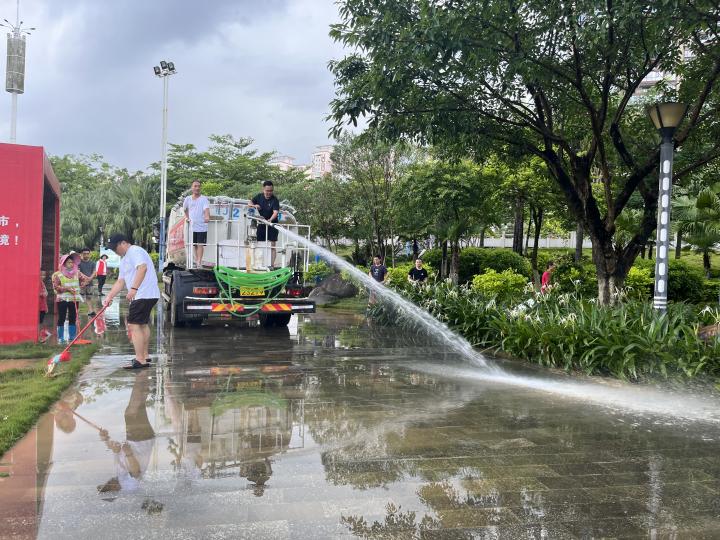 本次清理行動(dòng)分兩組進(jìn)行,一是加大路面保潔作業(yè)力度,對(duì)散落的樹枝、落葉及洪水?dāng)y帶上來(lái)的雜物進(jìn)行清理。二是人機(jī)結(jié)合,采取“沖洗+洗掃”聯(lián)合作業(yè)方式,對(duì)林蔭小道路面、公園廣場(chǎng)等地進(jìn)行深度沖洗,徹底消除洪水沉積淤泥。